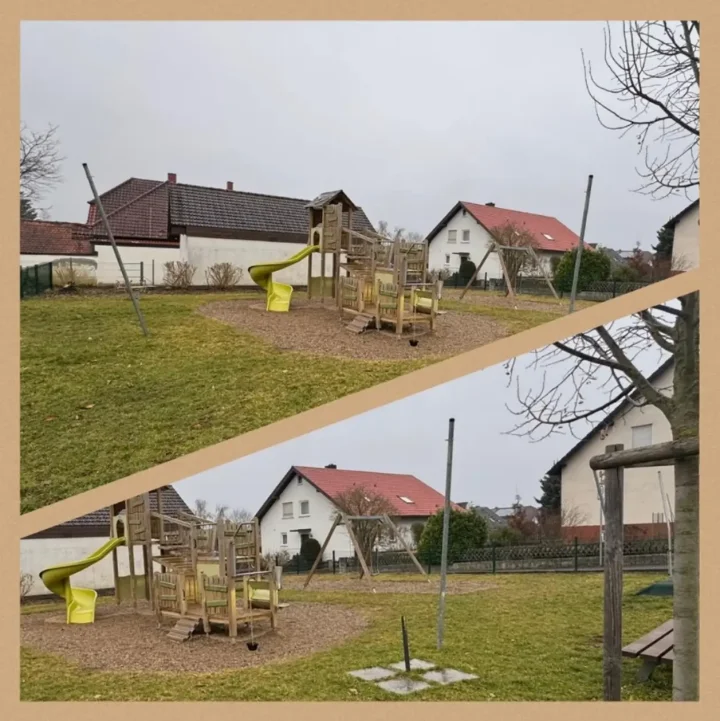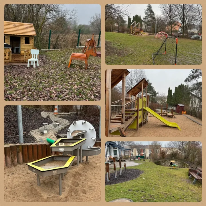 Unser großzügiger Außenbereich bietet den Kindern viele Möglichkeiten, ihren Bewegungsdrang auszuleben. Der Garten lädt zum Klettern, Rutschen, Matschen, Schaukeln und Entdecken ein.