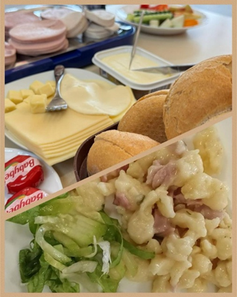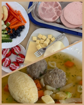 Die Regenbogengruppe und die Waldgruppe bekommen ihr Mittagessen von der Schulmensa. Hier wird täglich frisch gekocht mit regionalen Produkten.