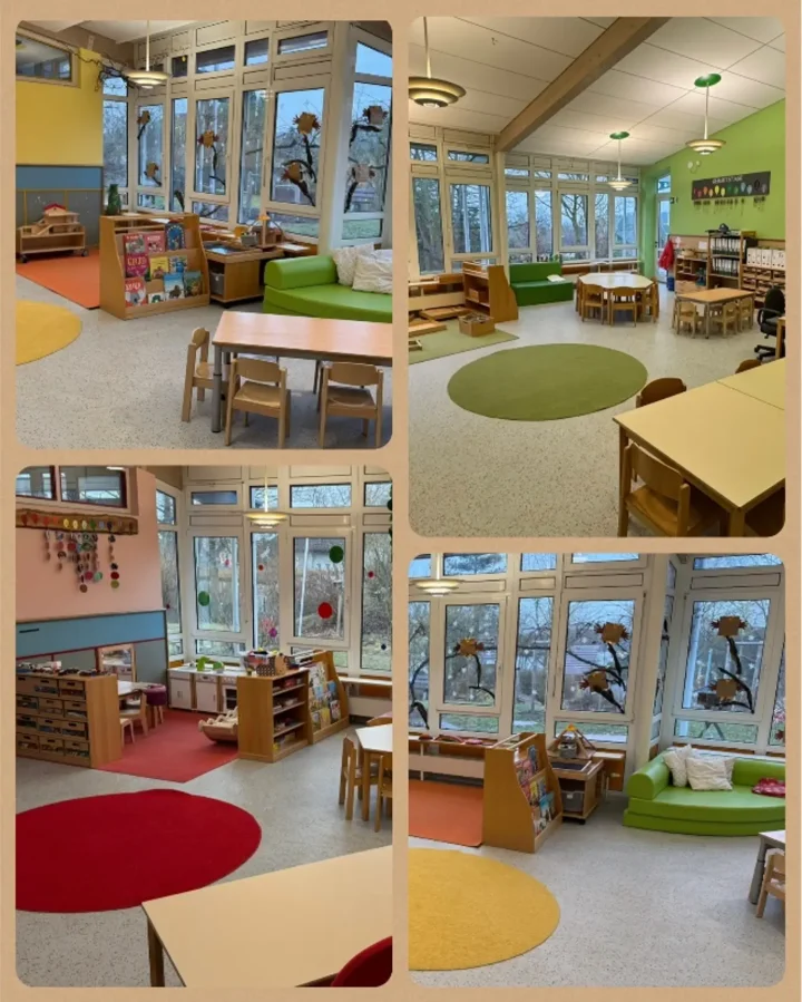 Die Blaue, Rote, Gelbe und Grüne Gruppe befinden sich im Haupthaus. Unsere Regenbogengruppe ist im Grundschulgebäude anzutreffen.