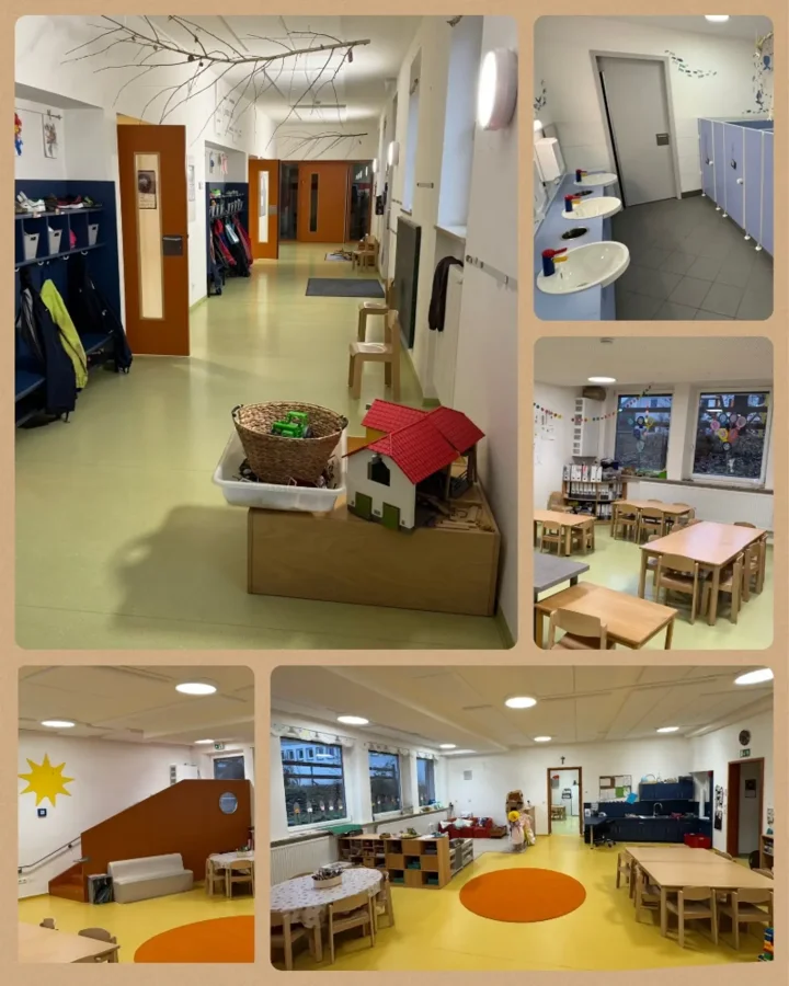Unsere Kindertagesstätte besteht aus vier Gruppenräumen mit jeweils einem Nebenraum zum Spielen oder Ausruhen, eigenen Sanitärbereichen und einer großen Garderobe. Der helle Flur bietet zusätzlichen Spiel- und Bewegungsraum. Eine eigene Turnhalle steht für wöchentliche Bewegungsangebote zur Verfügung. Ergänzt wird die Einrichtung durch Personalräume, Küche, Toiletten und verschiedene Stauraumbereiche.