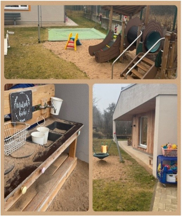 Der Außenbereich ist in zwei Bereiche aufgeteilt und mit unterschiedlichen Spielmaterialien ausgestattet. Wir achten darauf, dass sich kindliche Bewegungsformen wie Krabbeln und Laufen gemäß dem individuellen Reifeprozess entwickeln können. Wir unterstützen die Kinder dabei, ihren selbstbestimmten Rhythmus zu finden und legen geeignete Spiel- und Materialangebote bereit, die das Bewegungsverhalten anregen.